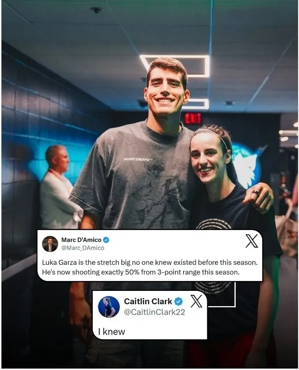 在大四这年,目前全世界最有名的女篮运动员凯特琳-克拉克也加入到爱荷华大学,她成了加尔扎的小学妹,两人让爱荷华大学知名度风靡全美,他俩作为校友也互相支持,就在昨天克拉克还在社交媒体对师兄进行鼓励,媒体报道加尔扎本赛季已成为NBA新的空间型中锋,三分命中率高达50%,克拉克转发并评论道:“我早就知道!”有看热闹不嫌事大高喊他俩在一起,实际上他俩目前都有各自对象.