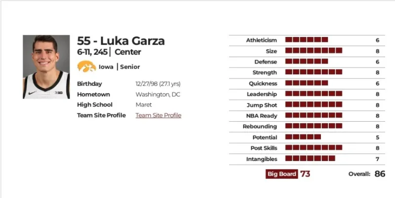 优点:爱荷华大学功勋球员,创造校史得分王纪录,连续两年入选全美最佳阵容、大十联盟年度最佳球员、全美最佳中锋,低位进攻技术自如流畅、得分手段丰富多样、手感柔和丝滑,在爱荷华大学最后两个赛季场均得分高达24分,展现出出色的得分能力,能拉开空间,并稳定高效命中三分球,大四赛季三分球命中率提升至44%,场均出手超过3次,作为中锋能里能的外进攻全面性在选秀中堪称一流,赛季结束后通过减重来提升横移速度和脚步速度,改变了原有体型,在选秀前各项测试中表现出色,大幅提升选秀口碑,他的比赛活力、积极性、职业素养出类拔萃,每次上场都会拼尽全力,比赛经验丰富,应该能够立即为球队做出贡献,他渴望进步并适应不断变化的比赛要求,这点在他从低位进攻球员转型为一名空间型中锋的过程中显而易见,极强的可塑性和充沛的斗志应该能让他对NBA一直保持冲击力,在低顺位球员中他是最值得信任的球员.